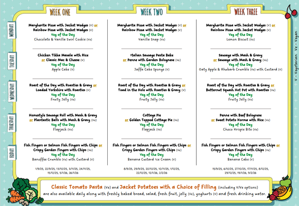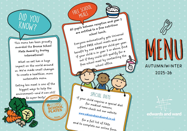 Children may bring a packed lunch into school or order a hot lunch. The hot lunches are freshly prepared by our catering team from Edwards and Ward at a cost of £2.60 per meal. The options are meat and vegetarian dishes daily; jacket potato and pasta are served as an additional option on alternate days. Water is provided.