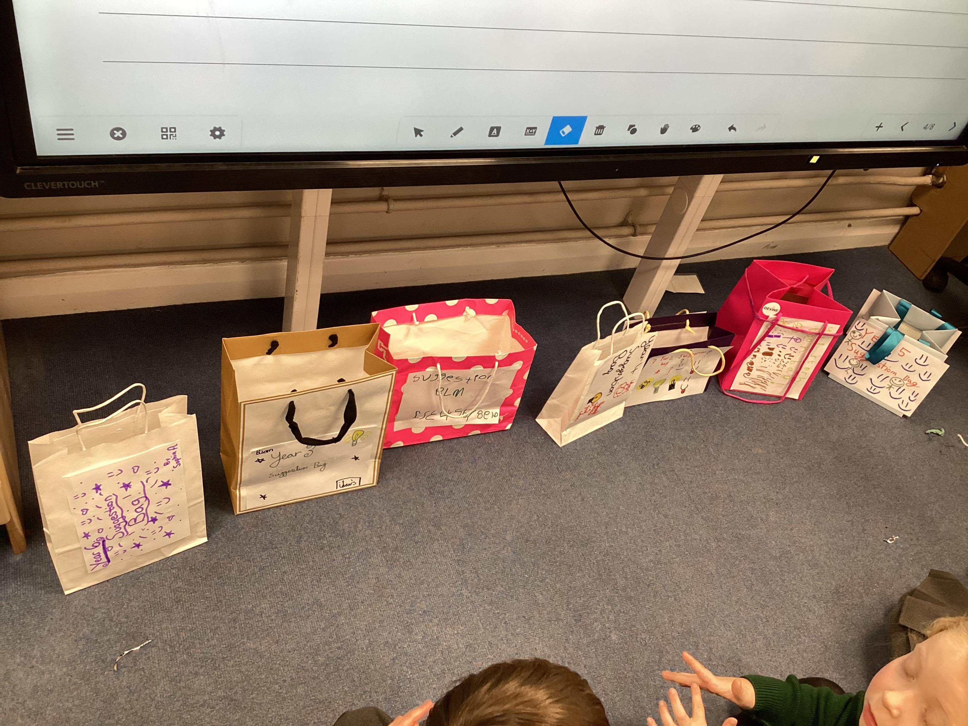 In our meeting each pair of representatives decorated a 'suggestion bag' for their own class. The children will be given time in class to complete the task of popping ideas into each bag before we gather them back on 31st January to review the contents.